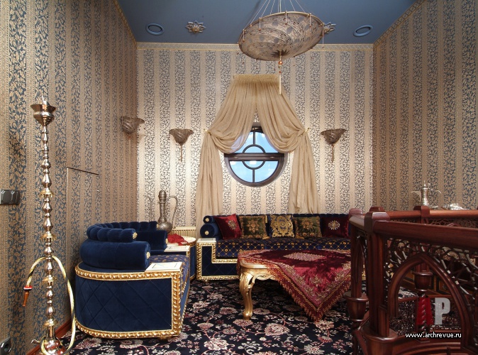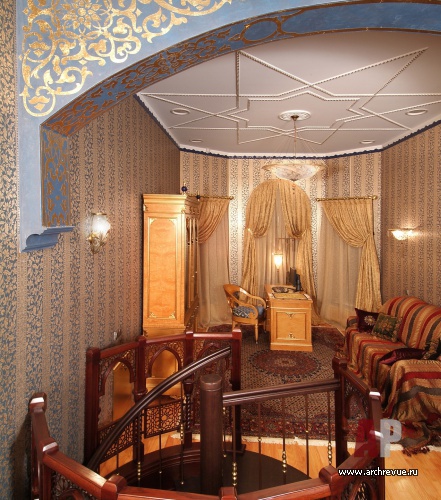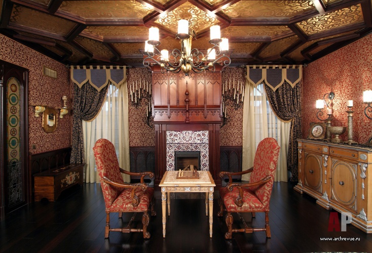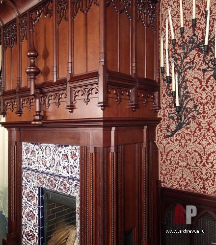 Декор этого дома можно назвать эклектичным. Это яркий стилистический микс готики, персидского Востока, французской классики и эпохи Ренессанса. Больше всего дом напоминает замок средневековый замок. Каждое помещение в нем, выполненное в собственном стилевом направлении, одновременно является частью единого интерьерного ансамбля, роль декоративных связок на себя берут дополнительные художественные приемы.