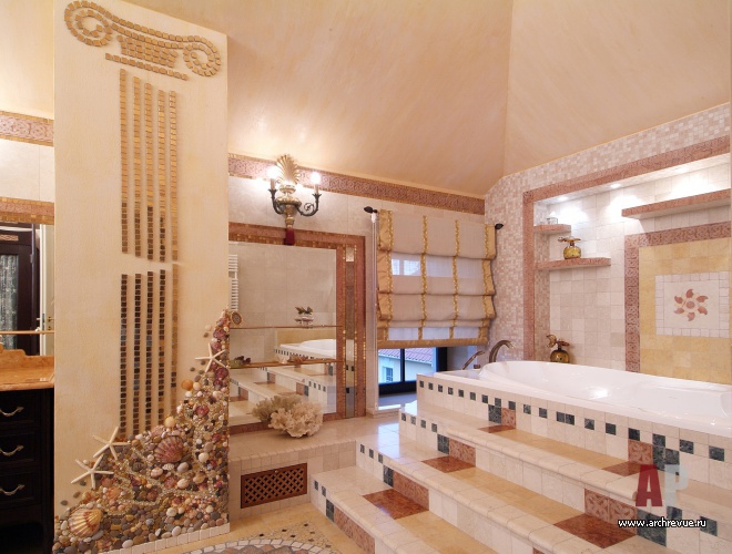 Мне близка стилистика эклектики, потому что детали играют для меня решающее значение. Необычные, рукотворные, прекрасные… Выкладывать ли ракушки и песчинки у подножия колонны в ванной, продумывать ли фактуру ковра в спальне, где каждый завиток подчеркнут петлевым серебром – все для меня настоящий праздник! Особенно интересно было работать с кессонированным потолком. Мы использовали такой способ финиша, при котором на поталь наносится орнамент, имитирующий деревянную резьбу.