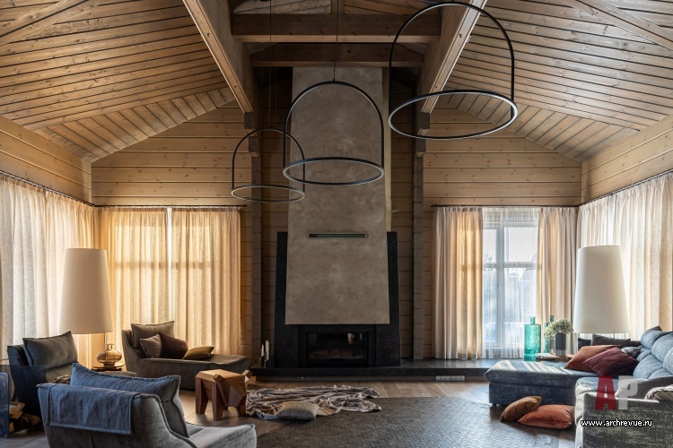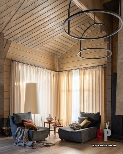 «При работе над проектом я руководствовалась формулой: масштаб - форма - комфорт- бюджет. Именно в таком порядке. В формах хотелось выдержать постоянно сменяющийся ритм прямых и кривых линий, который, на мой взгляд, позволяет повысить качество отдыха. Чтобы сохранить объем и свет, мы практически отказались от светильников с закрытыми абажурам, а, чтобы подчеркнуть связь с природой, использовали предметы с природными текстурами: светильники Mountain view, ковер «Чешуя», скульптурный столик Bearcoffeetable», - отмечает автор проекта. В итоге получился в меру брутальный тактильный интерьер с приглушенной палитрой, который существует в гармонии с красотой природного окружения.