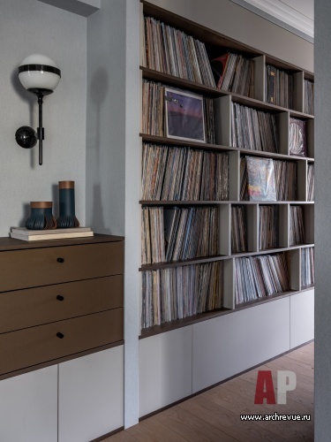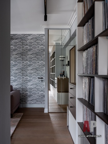 Дверные проемы были увеличены до 2,3 метра (при высоте потолка 2,6 м), сами двери выбраны однотонные в скрытых коробах: они сливаются со стенами. Дверь в санузел и вовсе растворяется на общем фоне благодаря отделке обоями. «Мы максимально убирали из виду все лишнее: кондиционер в спальне спрятали в навесном шкафу в нише слева от изголовья кровати, коллекцию винила убрали в большой и аккуратный стеллаж в коридоре, все конструктивные выступы обыграли как ниши или системы хранения», - отмечает дизайнер.