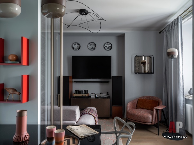Большую часть мебели и свет для проекта мы выбирали в «Интерьерном салоне № 1 компании МБТМ», часть аксессуаров старались приобрести во время пандемии в салонах из наличия, часть заказывали. Например, тарелки Fornasetti я рискнула и в разгар пандемии заказала напрямую из Италии, оформив доставку почтой на своё имя. В каждом помещении имеется встроенная мебель, она, как и стеллажи для проекта сделана по моим эскизам из итальянской плиты Cleaf в столярных мастерских, фурнитура Buster+Punch, Turnstyle Designs, Salice Paolo придает изделиям стильный вид.