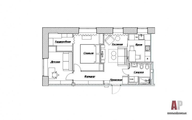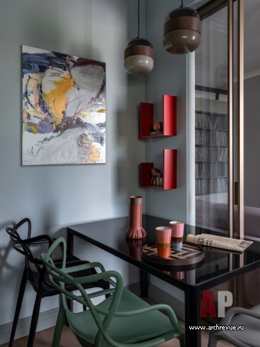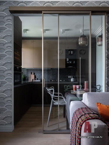 «В самом начале работы над проектом заказчик показал мне фото своей прежней квартиры с белыми стенами и чрезвычайно лаконичным дизайном и сказал, что хотелось бы сделать так же. Но опыт показывает, что в небольших пространствах наоборот необходимо использовать активный цвет, он делает пространство более интересным, «раздвигает» стены. Поэтому мы выбрали сложные, довольно насыщенные цвета фона и мебели и разнообразные деликатные фактуры. За время работы над проектом мне удалось научить его не бояться цвета и активных материалов, мы даже использовали обои с орнаментом в качестве акцентов», - рассказывает автор проекта. И, конечно, исходная планировка квартиры с проходной гостиной, очень маленькими кухней и санузлом, не отвечала запросам заказчика.