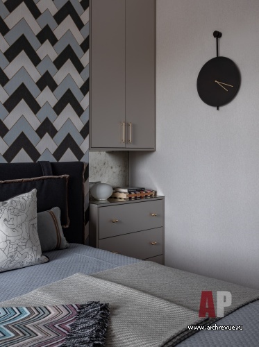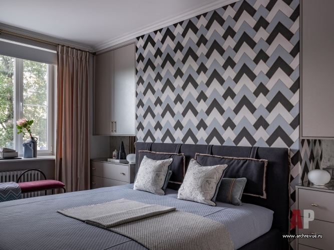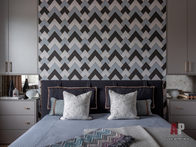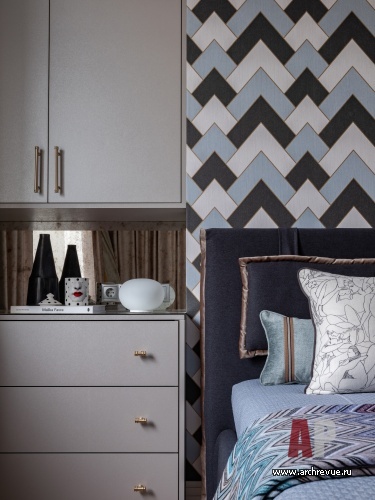 Спальня кровать Felis, поставщик «Интерьерный салон №1 компании МБТМ»; скамья AYTM, поставщик L’Appartement; прикроватные тумбы и навесные шкафчики выполнены по индивидуальным эскизам