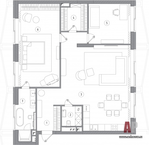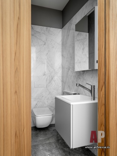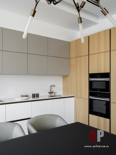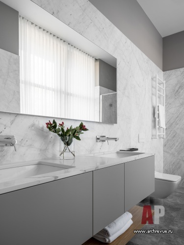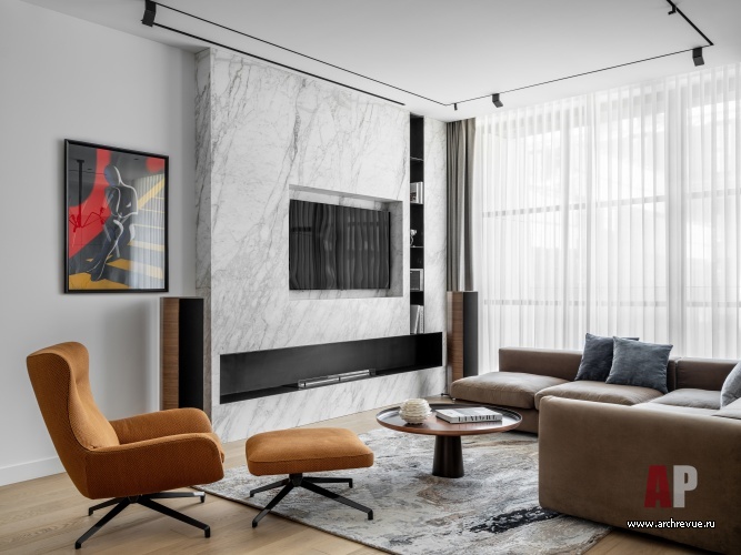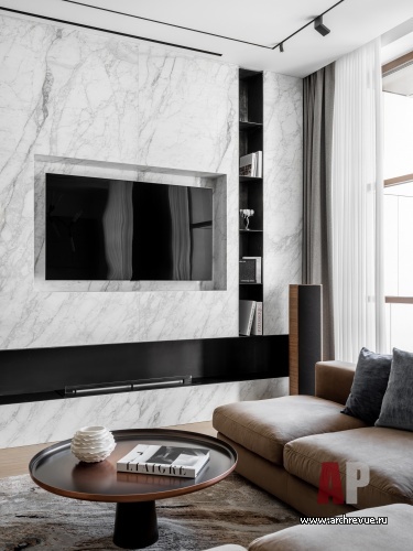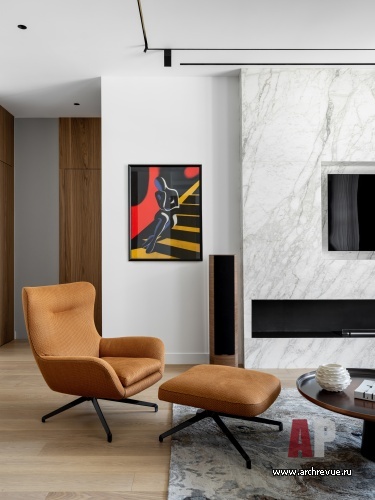 Доминанта гостиной – каменное панно из светлого мрамора, который привезли под заказ из Италии. Каменная стена объединяет большой телевизор с профессиональной музыкальной аппаратурой и камин. «Мы сделали ставку на спокойный, фоновый дизайн в нейтральной палитре, чтобы вывести на первый план дизайнерскую мебель уважаемых фабрик, предметы коллекционного дизайна (например, светильник Dragon Fly работы дизайнера Ольги Энгель) и в итоге получить современную квартиру европейского уровня, где можно качественно отдохнуть от городской суеты», - рассказывает автор проекта.