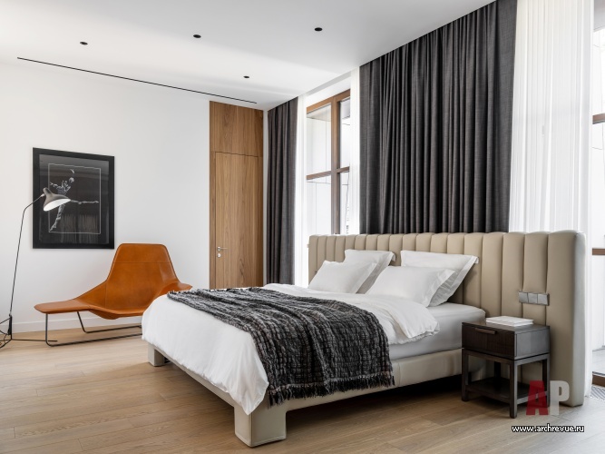 Спальня кровать Meridiani, тумбочки прикроватные JNL, шкаф Olivieri, кресло Molteni&C, лежанка Zanotta (модель Lama), бетонная консоль Forma&Cemento (модель Todeo); журнальный столик Baxter