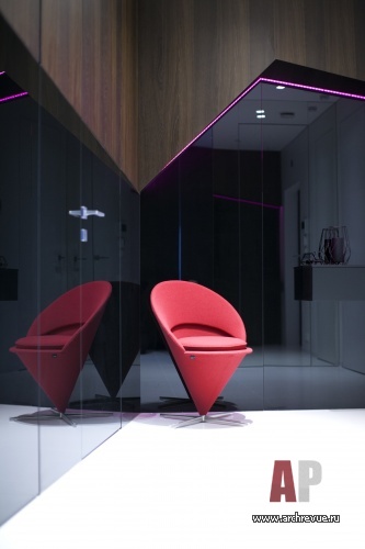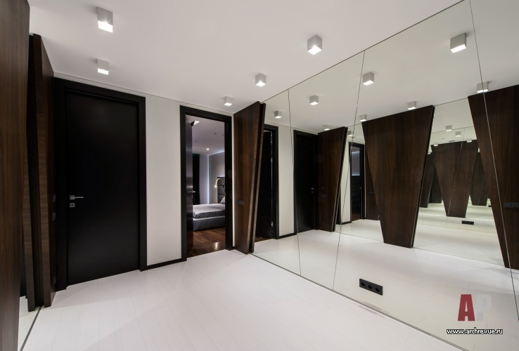 Архитекторы Элен и Майкл Мирошкины создают стильные минималистские интерьеры, в основе которых динамичная геометрия, лаконичный декор и технологичные решения, интегрированные в авторские изделия. При оформлении квартиры площадью 156 кв. м, расположенной на последних этажах новой высотки на Ленинском проспекте они сделали ставку на контраст двух материалов: дерева с теплой фактурой и холодного стекла. Объемная конструкция сложной формы с ломаными поверхностями, отделанная тонированным дубом и черным стеклом является связующим звеном между прихожей и гостиной, а также перекликается с отделкой кухни и приватных помещений.