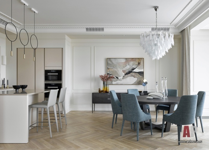 Легкий классический интерьер с модной обстановкой и современными деталями – такую задачу поставила интеллигентная семейная пара с двумя детьми перед дизайнерами TS Design. Прошлый интерьер заказчиков был выполнен в консервативном ключе, в новом жилье им хотелось больше свежести, света, невесомости… Квартира площадью 174 кв. м расположена в Московском районе Санкт–Петербурга, в ЖК «Победа, 5», который завоевал немало престижных профессиональных наград: чистая архитектура, правильные пропорции, хорошие планировки и масштабные объемы – все это вдохновляло на нетривиальный проект с обилием воздуха и классическими отсылками.