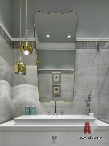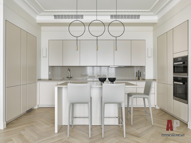 Интерьер полностью выполнен в едином ключе: легкий, классический каркас и современная начинка, создающая комфортную, расслабляющую атмосферу. Основная идея – легкость, визуальная и энергетическая. Отсюда и нежная, пастельная палитра стен, и инженерная доска из светлого дуба, и столярные изделия из белой эмали и выбеленного шпона, и глянцевые поверхности мокрой зоны.
