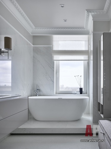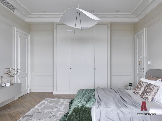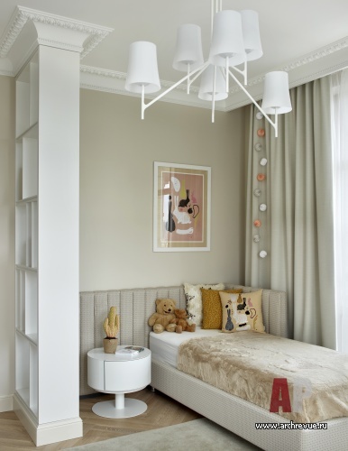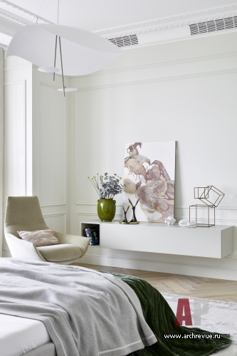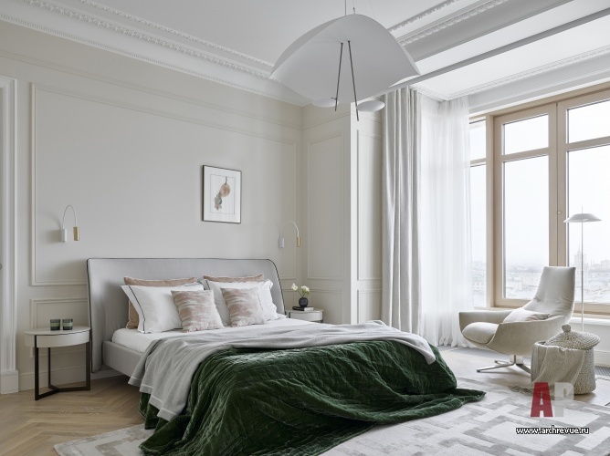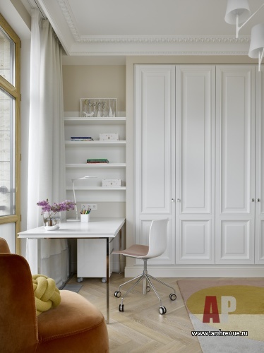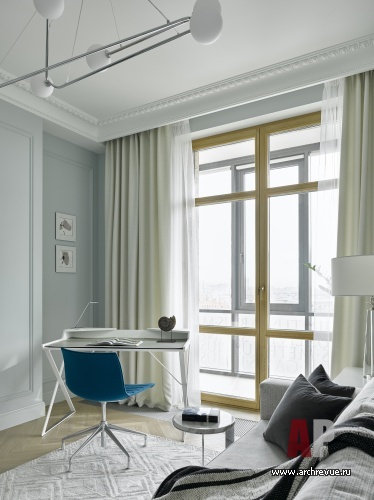 С разбеленной гаммой интеллигентно гармонируют ажурная белая лепнина, утонченных форм мебель и современные светильники, которые практически растворяются в пространстве. В спальне акцент сделан на кровать с округлой, уютной спинкой, а в кабинете и детской на оттенки питерского неба – прохладного дневного и теплого закатного.