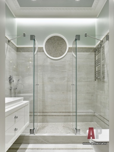 Сантехника ванна Noken, поставщик Zodiac; раковины унитазы Villeroy & Boch, смесители Axor, стеклянное ограждение душевой Kermi