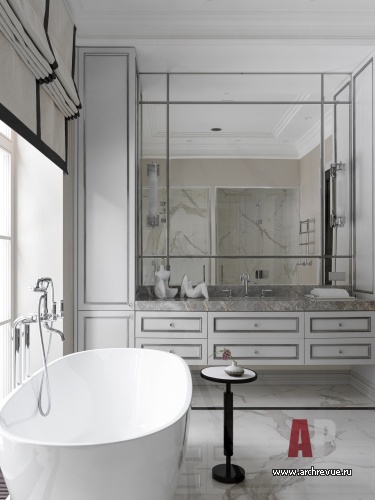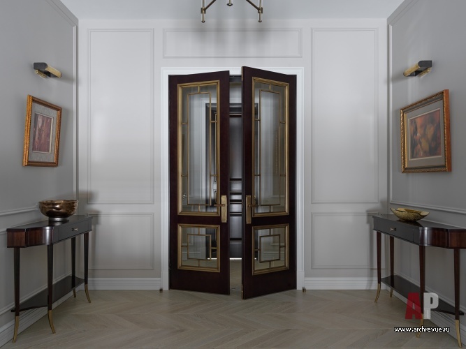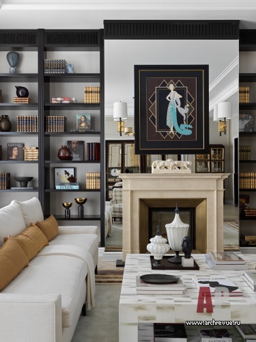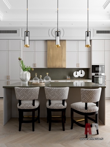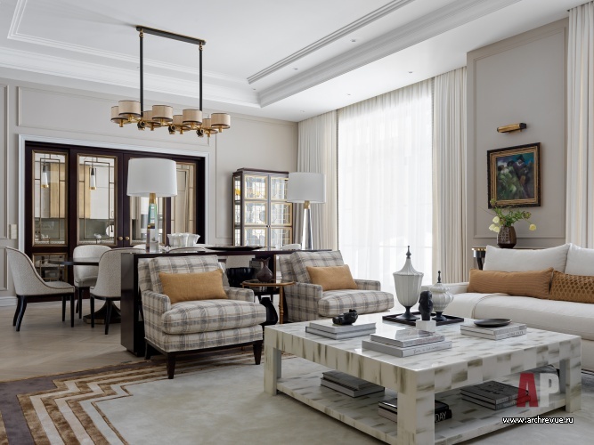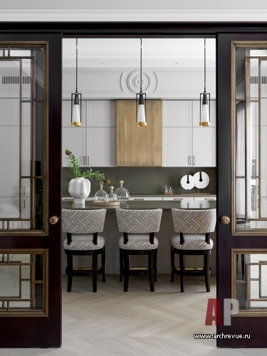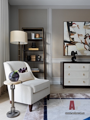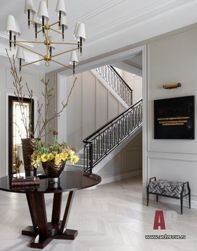 Интерьер выполнен в элегантной манере, в оформлении преобладает нейтральная палитра, она служит отличным фоном для контрастных дверей и авторской мебели из темного дерева с латунью. Значительная часть предметов, в том числе эффектные витрины в столовой и книжные стеллажи в гостиной, выполнены по чертежам дизайнера, остальные – американских или европейских брендов.