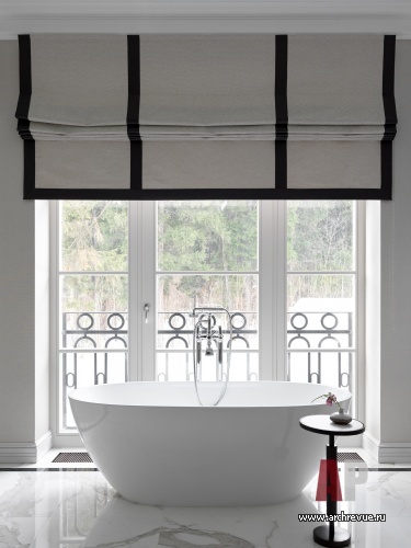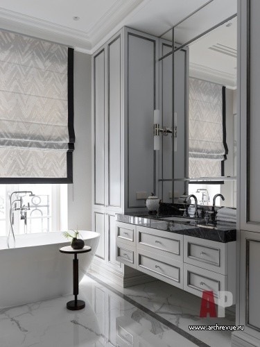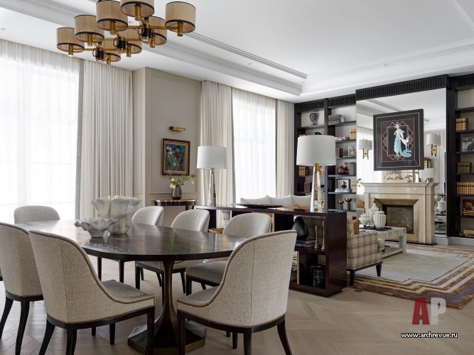 Все отделочные материалы высокого качества с благородной фактурой: натуральное дерево, камень, обои, ткани из шелка и шерсти – все это говорит о высоком статусе заказчика и его хорошем вкусе. Доминанта гостиной – камин с оригинальной латунной топкой, над ним – графическая работа Эрте, символизирующая прихотливую эстетику начала ХХ века.