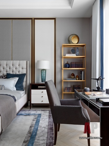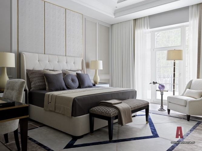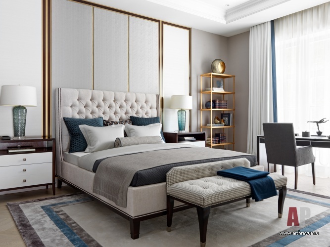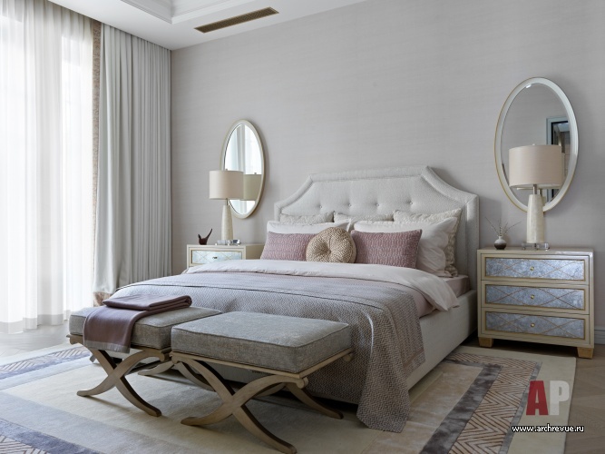 Гостевая спальня кровать Bernhardt, тумбы Century Furniture, банкетки Highland House