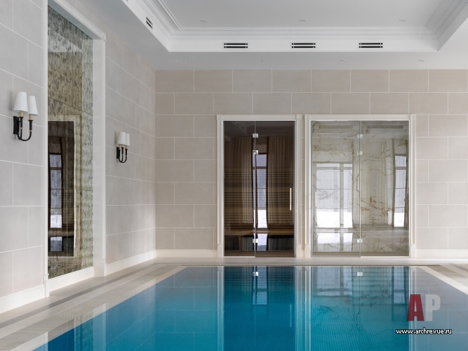Двухэтажный дом площадью 720 кв. м имеет традиционную планировку. Визитка дома – парадный холл с круглым столом по центру, из холла попадаешь в столовую-гостиную и кухню с выходом на просторную террасу. К представительским помещениям примыкает СПА-зона с большим бассейном и сауной, а также одна из трех гостевых спален.