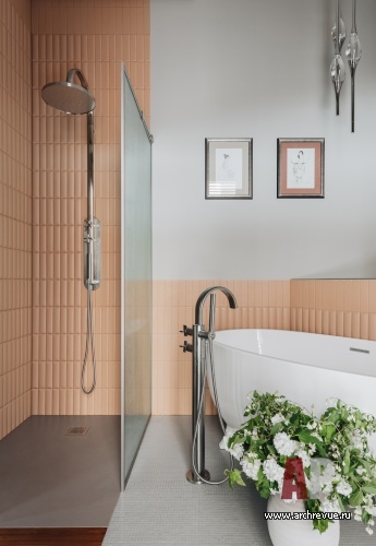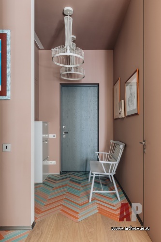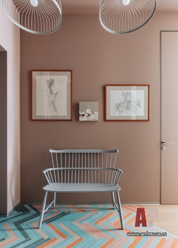 Интерьер создан по принципу традиционных французских квартир, где классическая архитектура и винтажная мебель соседствуют с функциональными решениями и современным искусством. Палитра интерьера светлая, воздушная: белые, пыльно-розовые, светло-коралловые и серые стены, натуральные полупрозрачные дубовые полы, пастельных оттенков керамическая плитка в санузлах. На этом фоне особенно весомо выглядит брутальная кухня из темного дерева и окисленного металла в обрамлении пестрого покрытия-террацо.