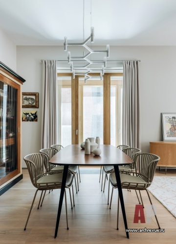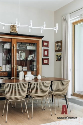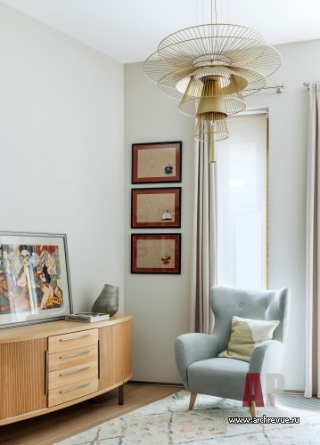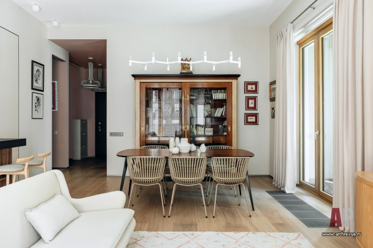 Мебель и светильники в проекте преимущественно французские, много эксклюзивных топовых и массовых брендов. Часть предметов изготовлена по индивидуальному дизайну, а другая переехала из старой квартиры заказчицы, как, например, роскошный книжный шкаф с классическим дизайном… Этот сплав винтажа и современных дизайнерских элементов работает на образ многопланового интерьера вне времени и создает непринужденную атмосферу.