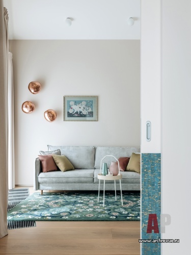 «Меня в планировке очень смущал полный обзор гостиной от входной двери, я стараюсь такого избегать, но клиентке это как раз нравилось, поэтому тут не стали выдумывать каких-то ограждающих элементов, зато в спальне как раз сделали легкую перегородку, отделившую входную часть от спального места», - отмечает архитектор. В итоге квартира получилось большой, открытой и очень светлой.