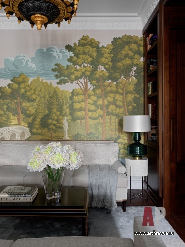 Заказчики живут на две страны, к тому же в России чаще бывают жена и дочь, тогда как муж и сын больше времени проводят во Франции. Эта особенность нашла отражение в оформлении интерьера: взяв за основу строгую классику, дизайнеры добавили изящества и романтики. Прямоугольная арка с лепными пилястрами между гостиной и столовой, буазери и стеллажи из темного массива дерева в каминной зоне, парадная ампирная люстра здесь сочетаются с обоями-фреской с видом усадебного парка, резным французским камином, утонченной мебелью столовой группы, белой кухней с зеркальными вставками.