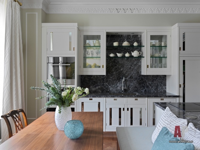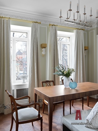 Заказчики проекта – русско-французская семья с детьми – хотели традиционный старомосковский интерьер для временных визитов в столицу: выдержанный и в меру строгий, но с изысканными деталями, характерными для классических европейских особняков. Взяв за основу типичное жилье московской интеллигенции, дизайнеры бюро создали интерьер-праздник, с подробным декором и легкой атмосферой.
