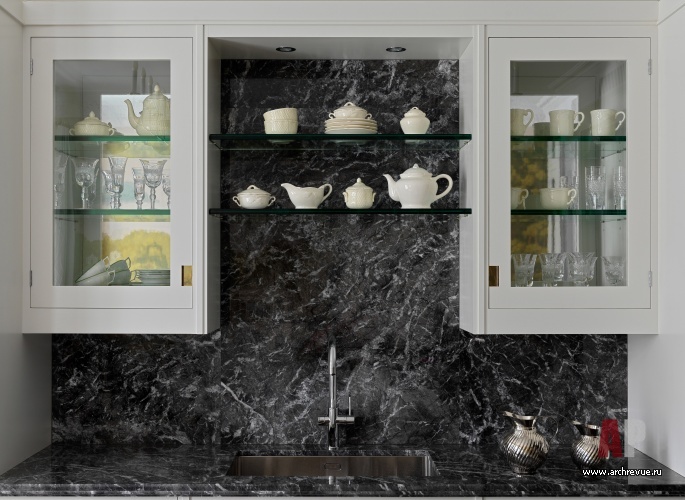 Техническое задание заказчиков включало две спальни, большой парадный холл (визитка дома) и камерную гостиную с камином, библиотекой и обеденным столом у окна с видом на тихий московский бульвар. Обеденная зона была особенно важна, поскольку в семье так принято, что все дружеские встречи проходят именно за столом. Поэтому для комфорта дизайнеры разместили здесь антикварные стулья и удобный миниатюрный диван с подушками, который примыкает к кухонному острову.