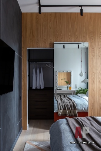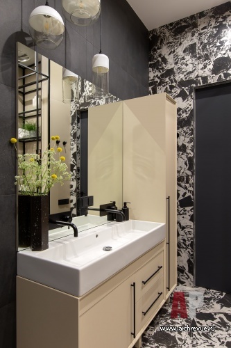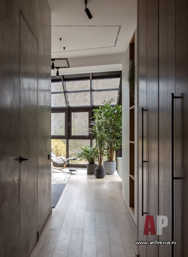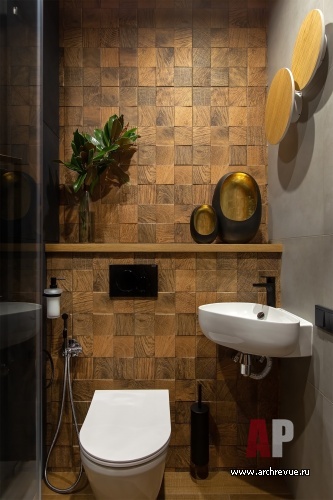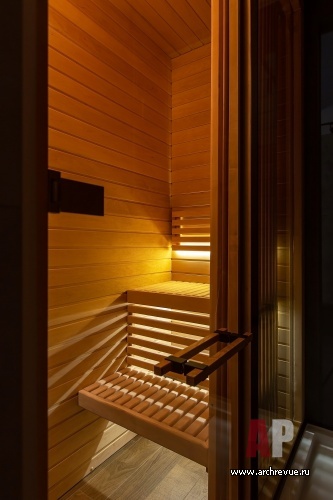 Два санузла и вспомогательные помещения расположены в темной части квартиры. Одним из пожеланий заказчика стала сауна, которую архитектор вписала в пространство гостевого санузла, а также наличие кладовой при входе, которая одновременно служит гардеробной для верхней одежды.