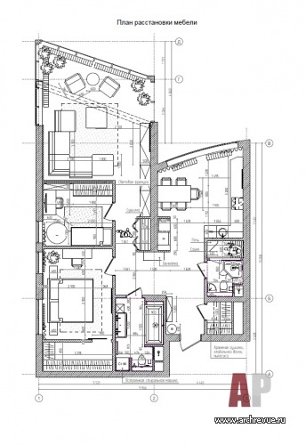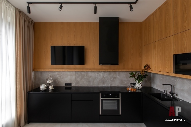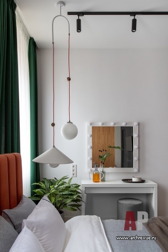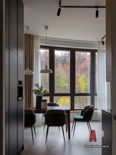 Квартира имеет сложный план с острым углом фасада и радиусным остеклением. Гостиная занимает самое эффектное место – с оранжерейными окнами и видом на лес. Неправильную геометрию дизайнер скорректировала с помощью расстановки мебели и линейного оформления стен. Кухня-гостиная изолированные с эркерным окном. Хозяйская спальня с выходом в гардеробную находится в глубине квартиры, к ней примыкает детская.