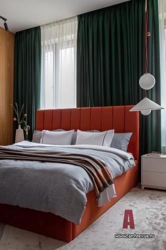 Яркие открытые цвета используются только в текстиле: зеленые стулья в столовой, оранжевая кровать в хозяйской спальне… Мощным акцентом служит и декоративное двухметровое панно, написанное специально для этого интерьера в красках природы за окном. Важное значение в интерьере играет панорамные остекление, оно делает квартиру похожей на зимней сад или оранжерею. Окна изготовлены из металлопрофиля и имеют красивый графичный рисунок. Чтобы не перекрывать вид и сохранить ощущение воздушности, дизайнер предложила не использовать портьеры, только легкие солнцезащитные шторы-плиссе. Благодаря такому решению со сменой природного сезона меняется и интерьер, наполняется новыми красками, живет в ритме с окружающей средой.
