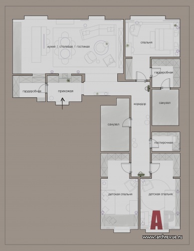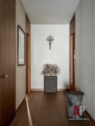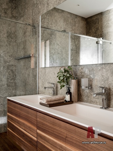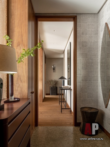 Заказчики приобрели квартиру площадью 170 кв. м с частичной отделкой от застройщика и готовыми инженерными решениями (в частности, системой «умный дом»). «Это был тот редкий случай, когда предложенные застройщиком решения можно было посмотреть заранее, в квартире-шоу-руме, и они были не случайными и качественными», - рассказывает автор проекта. В итоге было решено оставить материалы пола (фактурный известняк и инженерную доску), плинтус, отделку и комплектацию двух санузлов, кухонную мебель Valcucine, межкомнатные двери в шпоне американского ореха. Исходные материалы вместе с современной архитектурой дома стали отправной точкой для дальнейшего развития интерьера.