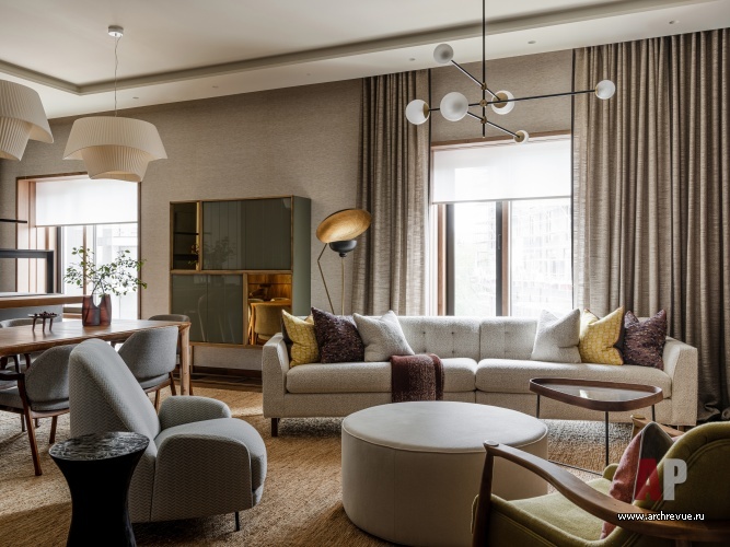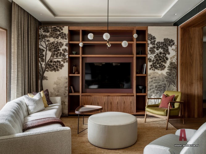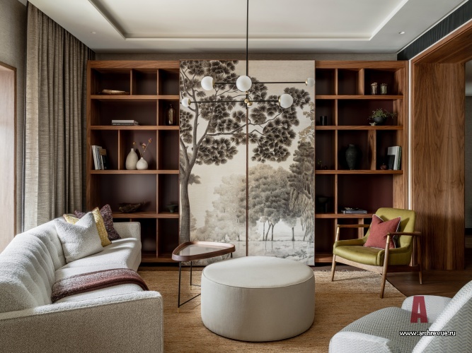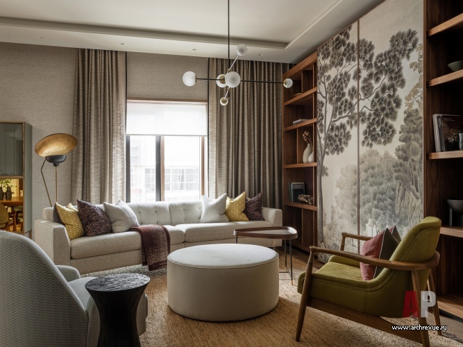Гостиная диван Precedent Furniture в ткани Pierre Frey, поставщик Design Place; шкаф, на заказ, по эскизам дизайнера, на фасадах панно Iksel Decorative Arts; мягкий стол-пуф, поставщик «АртСтиль»; столики Porada и Julian Chichester, кресло Tacchini в ткани Le Manach