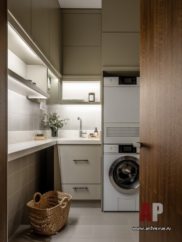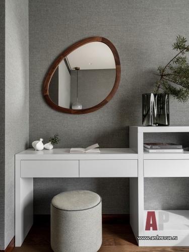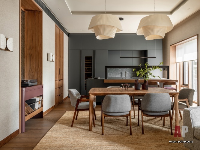 Настроение покоя создают также плавные, струящиеся линии, смягченные контуры и округлые формы предметов мебели и декора. Выбирая мебель, дизайнер не охотилась за громкими именами и брендами, а просто искала подходящие линии и масштабы. Мягкие формы и некричащую роскошь – ту, необходимую для создания спокойного и статного интерьера органику – дали культовые винтажные предметы, ставшие в свое время вызовом мебельной индустрии. Вместе с современной кухней и авторской мебелью они создают многослойный интерьер, который раскрывается постепенно и обволакивает теплом и комфортом.