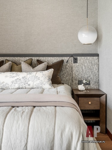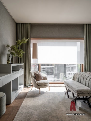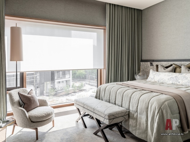 Хозяйская спальня кресло Flexform в ткани Pierre Frey, банкетка и пуф Pierre Frey, поставщик Empire Design; консоль с туалетным столиком, прикроватные тумбы по эскизам дизайнера, на заказ; изголовье кровати в ткани Pierre Frey, по эскизам дизайнера – изготовление «АртСтиль»; матрас Vispring, поставщик ROSBRI
