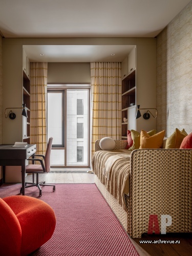 Детская спальня кровать изготовлена на заказ по эскизам дизайнера в ткани Le Manach – изготовление «АртСтиль»; матрас Vispring, поставщик ROSBRI; кресло Gubiв ткани Kvadrat, поставщик Empire Design; корпусная мебель и рабочий стол по эскизам дизайнера, на заказ; рабочий стул Arper в ткани Kvadrat