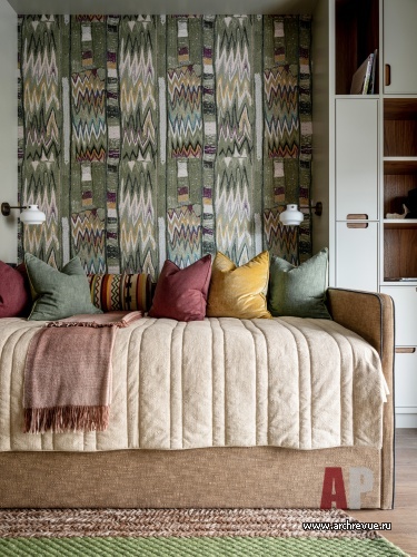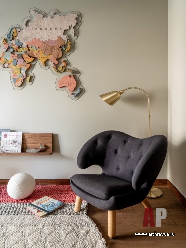 Детская спальня кровать изготовлена на заказ по эскизам дизайнера в ткани Pierre Frey – изготовление «АртСтиль»; матрас Vispring, поставщик ROSBRI; корпусная мебель по эскизам дизайнера, на заказ; винтажное кресло Finn Juhl (модель Pelican Chair), 1940 г, поставщик Gallery Beke