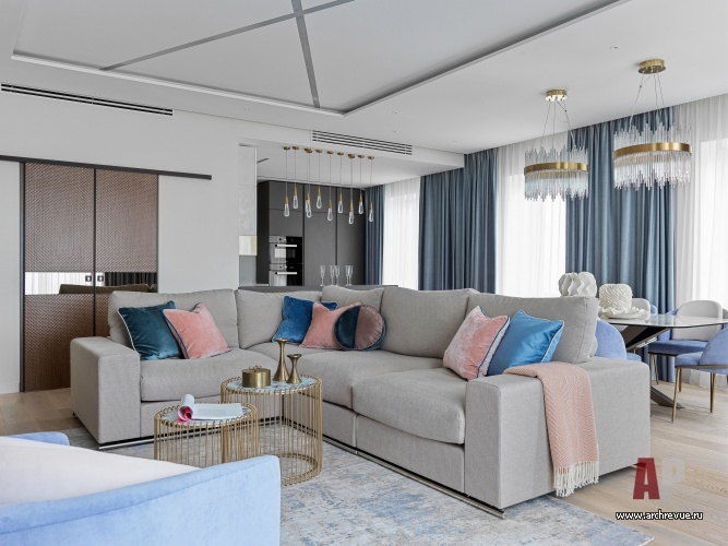 Интерьер оформлен в современной респектабельной стилистике с элементами классики. Он выглядит воздушным и элегантным благодаря нежной пастельной палитре в оттенках голубого, розового, светло-бежевого и светло-серого. В оформлении использованы качественные натуральные материалы: камень и широкоформатный керамогранит с фактурой мрамора, дерево, декоративная штукатурка с бархатной текстурой…