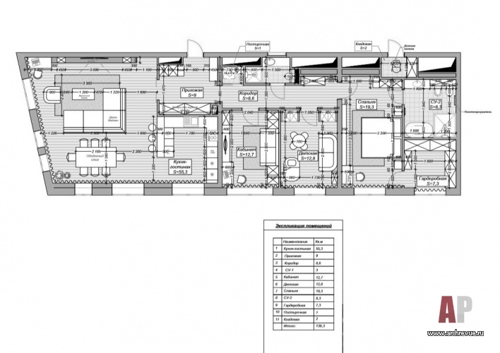 Квартира расположена в современной новостройке. Объединение трех небольших однушек в одно пространство позволило четко обозначить общественную и приватную территории – то, о чем мечтали хозяева. Гостиную, столовую и кухню дизайнеры сгруппировали в одной части квартиры, а кабинет, детскую, спальню, санузлы и гардеробную – в другой. Разные по назначению зоны связывает сквозной коридор с динамичным оформлением и встроенной подсветкой.