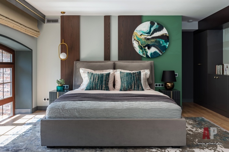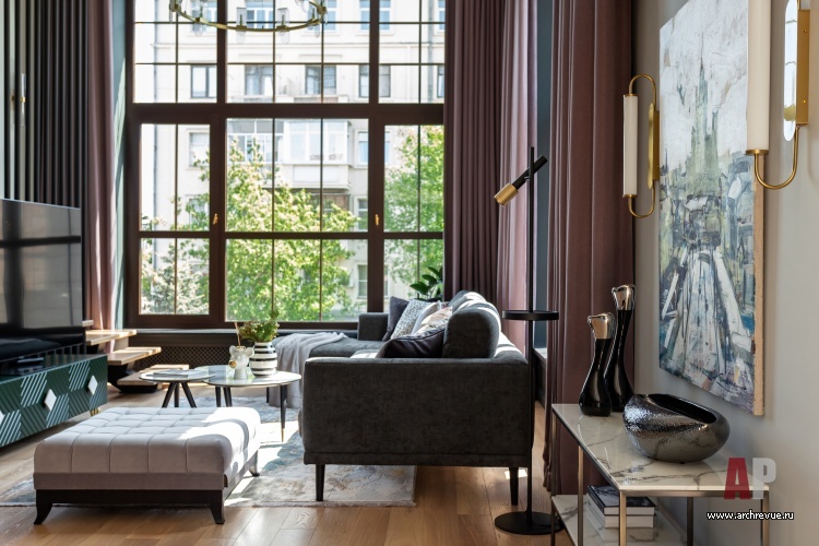 Интерьер оформлен в духе современной классики с элементами лофта. Высокие арочные окна с деревянными переплетами и видом на кирпичную застройку в интерьере поддерживают экологичные материалы с натуральными текстурами. На полу – инженерная доска из дуба с желтоватым оттенком, который хорошо гармонирует с зелеными акцентами и темными цветами асфальта в декоре дивана и кухни.