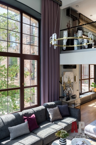 Дизайнеру досталось непростое, но очень интересное пространство высотой более 5 метров, с панорамными арочными окнами, вторым светом, надстроенной антресолью и вытянутым планом. Следовало уйти от «туннельного» ощущения и максимально раскрыть пространство. Кроме того, в объеме шириной 4,6 метров необходимо было разместить лестницу и сделать это так, чтобы сохранить простор и не утяжелить интерьер.