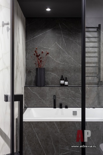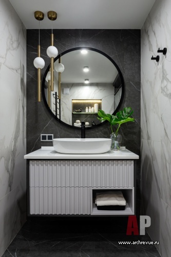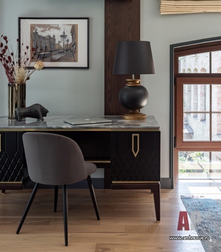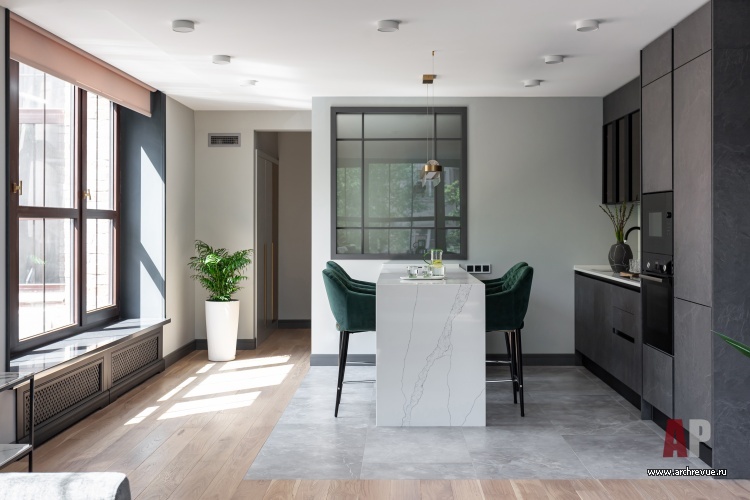 Первоначально заказчик хотел минималистский брутальный интерьер в черно-белой палитре, но в процессе стало понятно, что ему ближе современная классика со сложными цветами и мягкими текстурами. Да и локдаун, на время которого пришелся старт ремонтных работ, наложил свой отпечаток: в интерьере появились насыщенные зленые акценты, которые вызывали ассоциации с весенней цветущей Москвой.