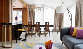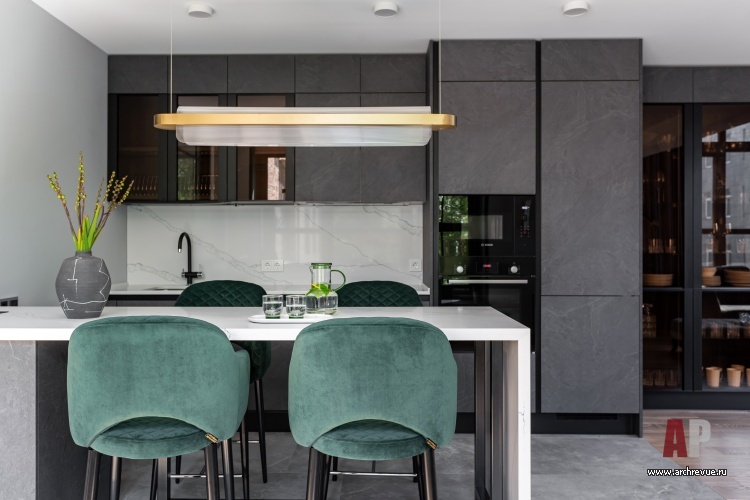 На контрасте с классической утонченной гостиной выступает кухня с лаконичными фасадами «под бетон» и островом, облицованным кварцитом с фактурой мрамора Calacatta. Стены во всех помещениях выкрашены итальянской краской с бархатистой матовой текстурой: в гостиной использован сдержанный серой оттенок, а в спальне – насыщенный зеленый. Третий, после серого и зеленого, главный цвет проекта – темно-лиловый, он добавляет интерьеру яркости и выразительности.