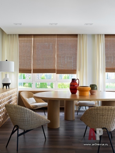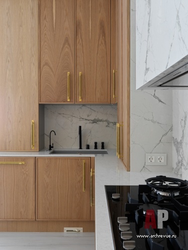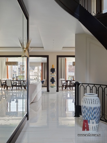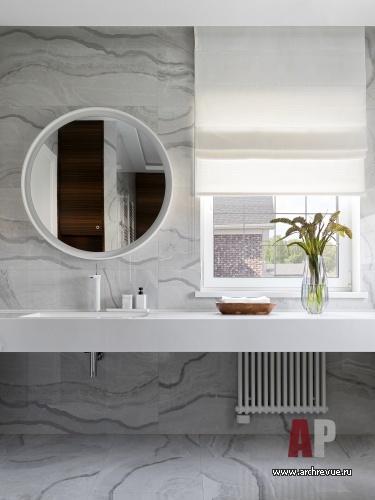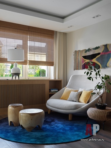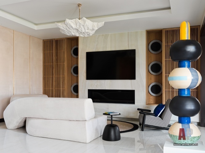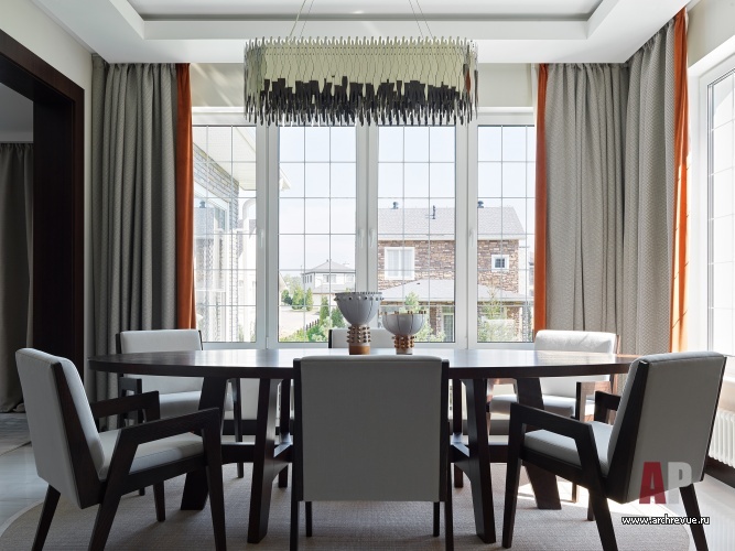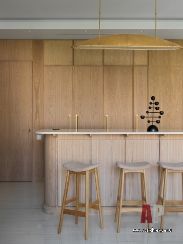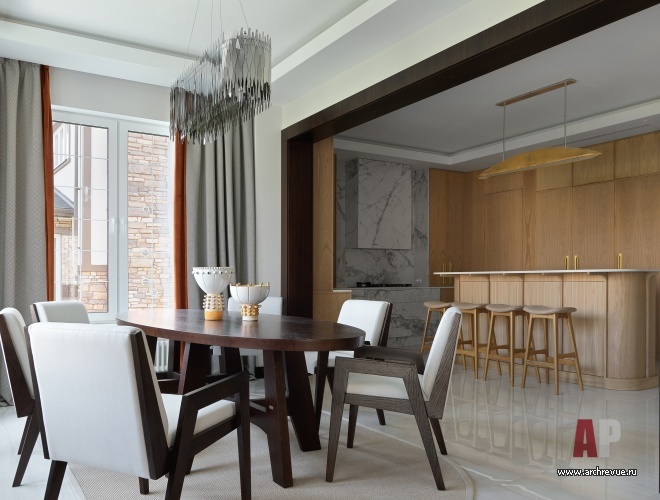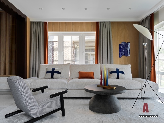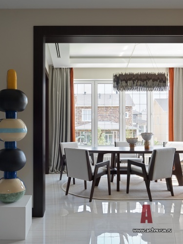 Стремясь уйти от скучного монохрома, дизайнер добавила яркие цветовые акценты, арт-объекты и текстиль, а, чтобы добавить проекту индивидуальности, сделала ставку на авторскую мягкую и корпусную мебель. Кухня также была полностью разработана в индивидуальном порядке. «Мы сильно потрудились над тоном шпона для кухни и прочих деталей. Цвет был выбран очень сложный, благородный и глубокий. Он сразу соединил и глянец керамики, и моренный эвкалипт на порталах, и добавил света в дом!» - рассказывает автор проекта.
