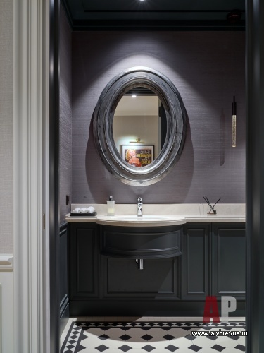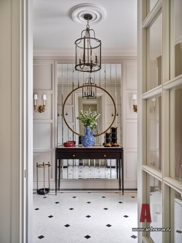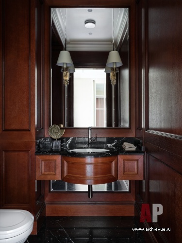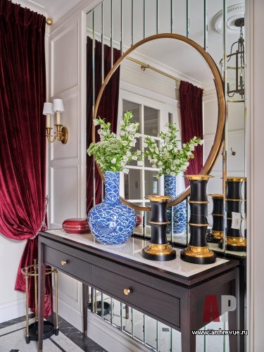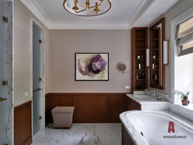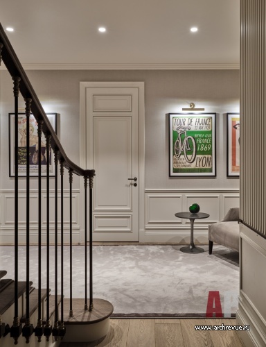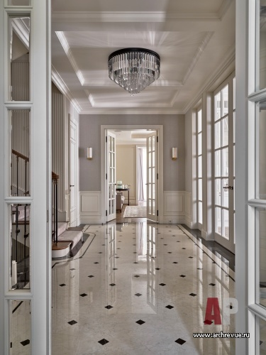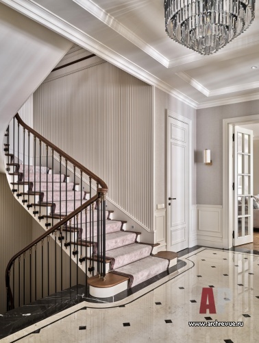 Материалы использованы натуральные, качественные, с благородной фактурой: мрамор, дерево, шелковые обои, бархатная окраска, лепной декор… С особой тщательностью проработан парадный лестничный холл: стены облицованы мебельными панелями с филенками, потолок украшен кессонами, на полу – классическая раскладка из мрамора Crema Marfil и Nero Marquina, деревянный поручень поддерживают изящные кованые балясины.
