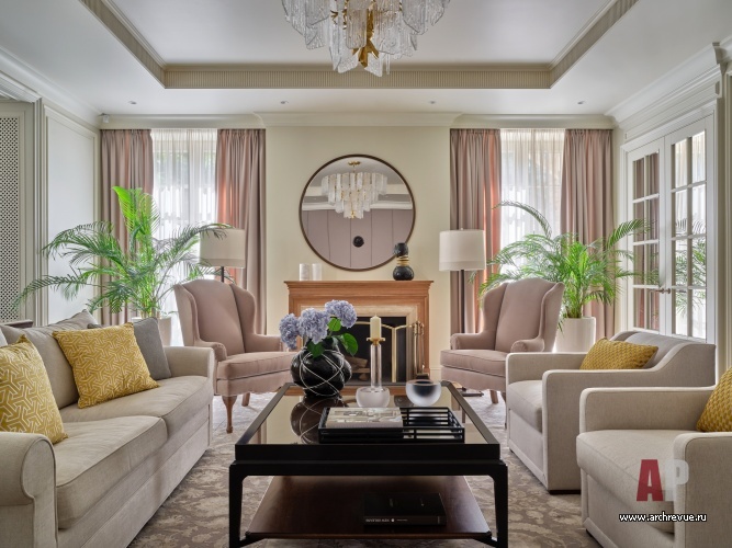 Гостиная диваны Thomasville, кресла Baker, каминные кресла и журнальный столик Century Furniture, кресла Hickory Chair
