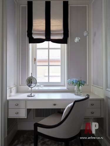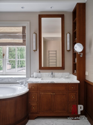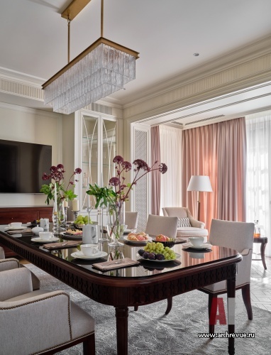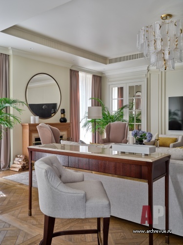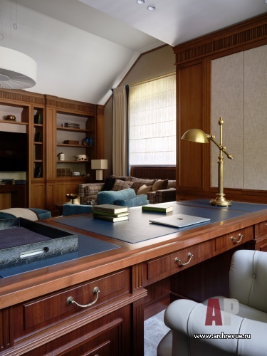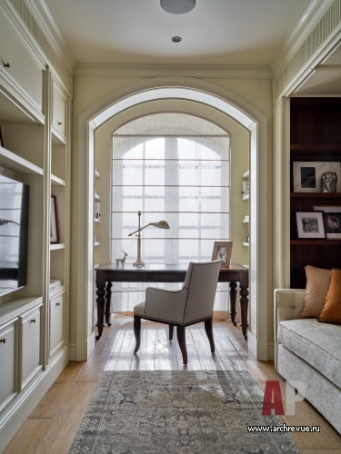 Интерьер дома выполнен в элегантном ключе с обилием воздуха, света, акцентного декора. Основные помещения выдержаны в светло-бежевых пастельных тонах с применением темных пород дерева в мебели и в сочетании с теплым медовым оттенком дуба или светло-бежевого мрамора на полу. Иная тональность присутствует в кабинете, он оформлен в приглушенных синих тонах, теплых оттенках дуба, тонированного под орех, и бежевых цветах текстиля.