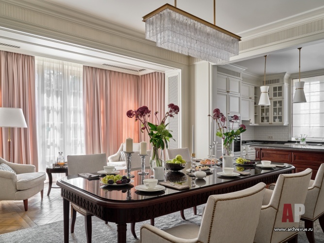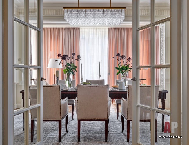 В гостиной и столовой к стилеобразующим камню и крашенному дереву добавляются дубовый модульный паркет, гипсовые молдинги и стеновые текстильные панели, они создают уютную и непринужденную атмосферу.