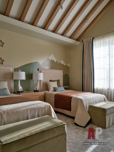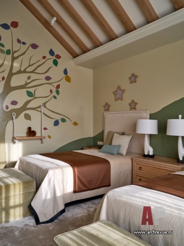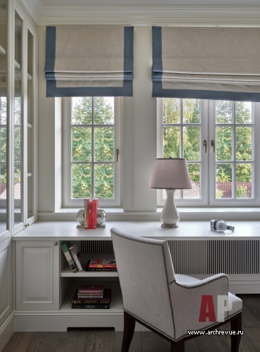 Второй этаж – приватная территория, она включает хозяйскую спальню с балконом, ванной комнатой и гардеробной, две детские комнаты и кабинет. Кабинет расположен в мансарде и имеет сложную геометрию, которую дизайнерам следовало увязать со скошенными потолками и встроенной мебелью.