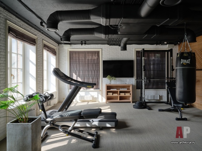 Контрастная гамма характерна и для спортзала, но здесь акцент сделан на брутальный клинкерный кирпич на стенах, реечные шпонированные панели и виниловое напольное покрытие в стиле лофт. Выбор материалов обусловлен практичностью в уборке и износоустойчивостью, поскольку в семье растет юный спортсмен – старший сын, он участвует в соревнованиях и получает награды.