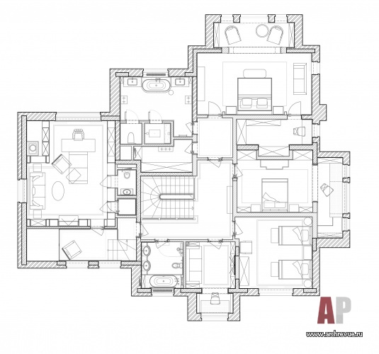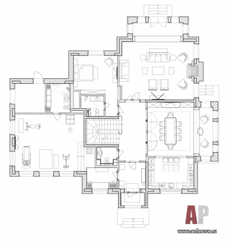 Все парадные помещения отлично просматриваются из центрального холла и воспринимаются как единое целое. Кроме того, здесь же находится гостевая спальня и спортивный зал (его площадь составляет 40 кв. м) с санузлом, выделенный в самостоятельный блок.