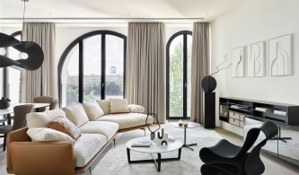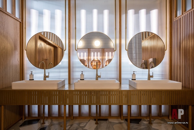 Теплое натуральное дерево делают еще более уютным и солнечным золото и латунь, а сказочности интерьерам добавляют похожие на небесные светила декоративные ламы. Тактильные фактуры, авторская мебель и отделка, солнечная палитра и ажурный декор – результат подробного исследования русской культуры и переосмысления понятий национальной идентичности, менталитета и архитектуры.