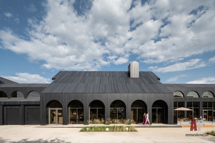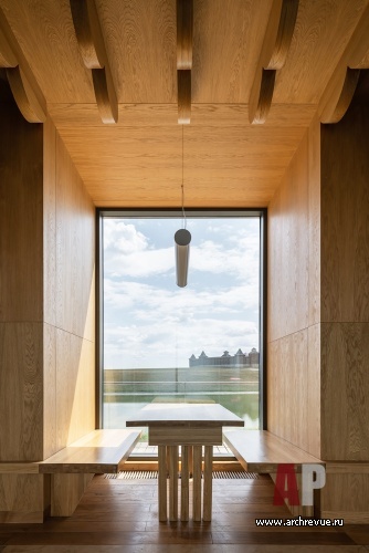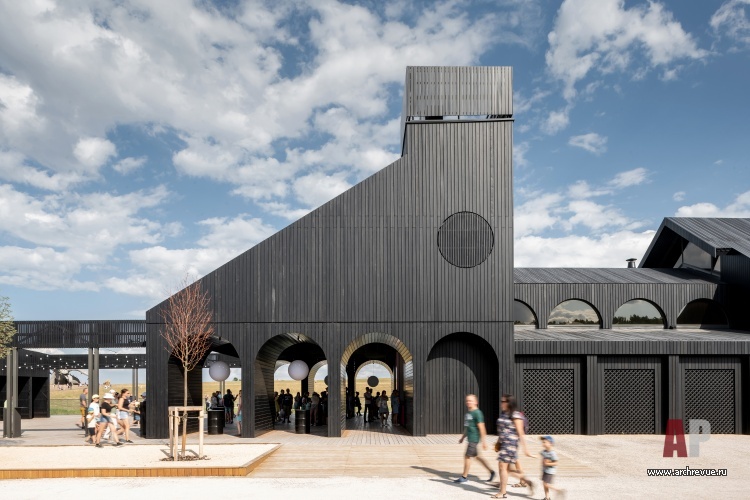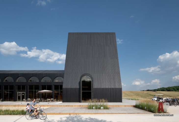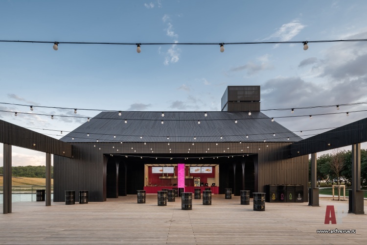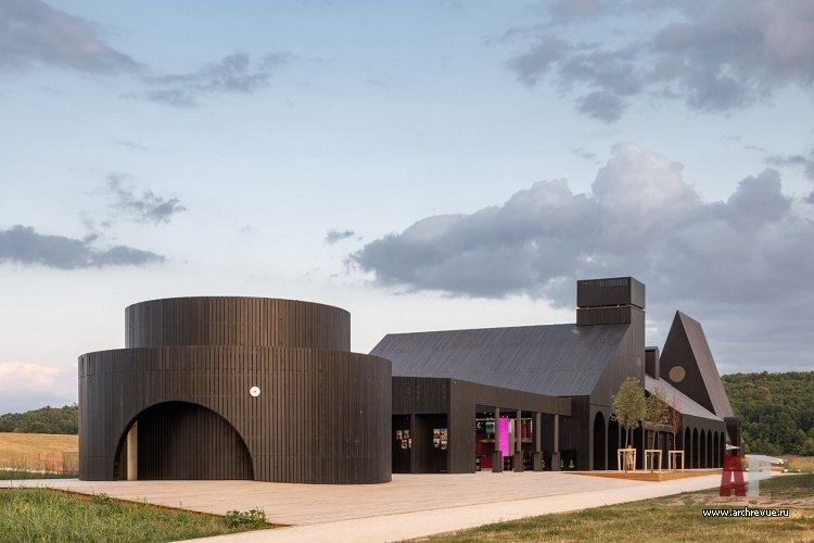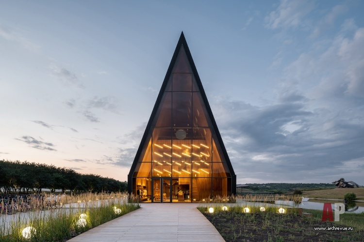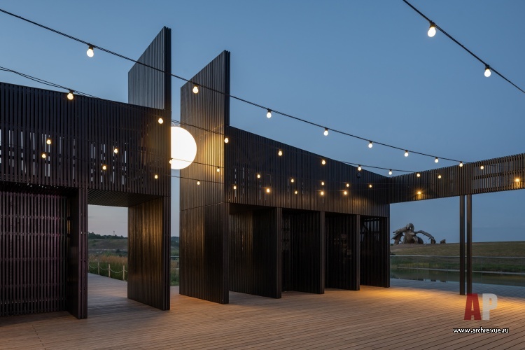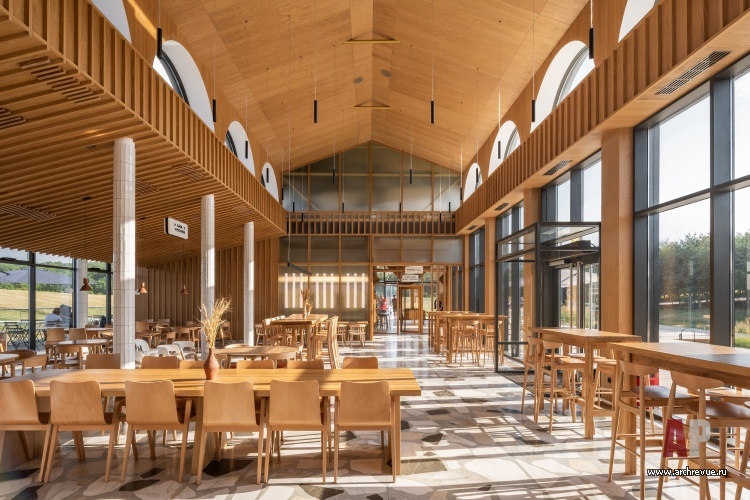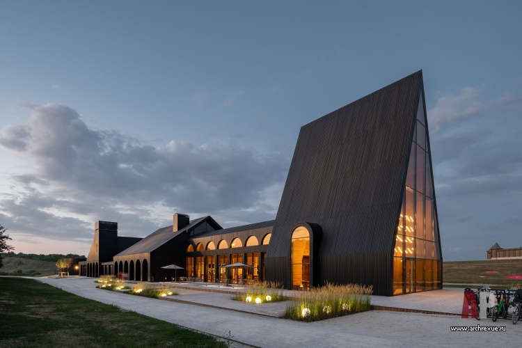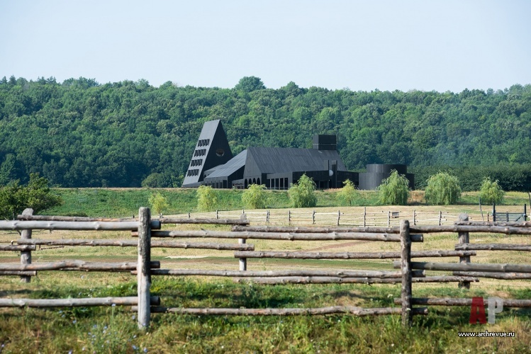 А недавно появилось и удивительное трехэтажное строение, в котором соединились черты традиционного русского зодчества, архитектурной классики и советского авангарда. Комплекс состоит из отдельных разновысоких блоков. Внутри каждого объема – своя функция, снаружи они создают комфортный масштабу фронт застройки, напоминающий фрагмент улицы старого города. Все блоки стоят на едином стилобате, их объединяет деревянная терраса, которая благодаря использованию перепадов рельефа служит великолепной обзорной площадкой. Архитектура имеет особый смысл, в ней закодированы архитипичные символы. Так уступчатый, нависающий над высокой травой стилобат напоминает древнерусскую ладью. Ресторан со стороны парковки со скатной кровлей и башней похож на часовую башню – главный элемент кремля или любого другого защитного сооружения. Комплекс завершает круглый объем санузлов, такая форма позволяет гибко пристроить практически любой конфигурации новый блок – что особенно важно, поскольку комплекс планирует расти и развиваться.