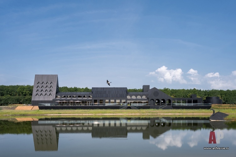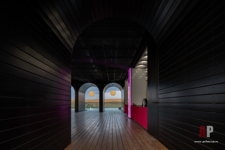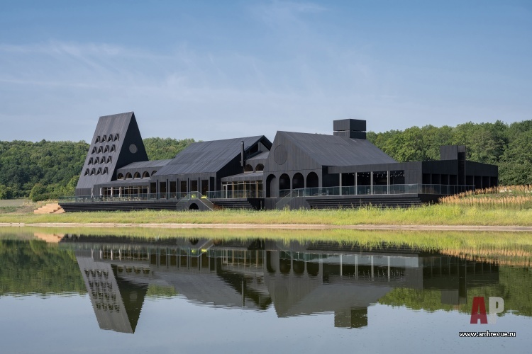 Фасады выполнены из черного дерева, где черный – это цвет выгоревшей под солнцем доски, главного материала русской деревянной архитектуры. В деталях также отсылки к образу терема или избы: прорезанные в скатной кровле треугольные «слуховые окна», линейный орнамент решеток, поясков, щелей… С ними гармонируют ампирные полукруглые окна и панорамные витражи, которые создают иллюзию невесомости здания и словно растворяют его в природном ландшафте.